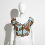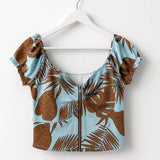 Bring the vacation vibes to your wardrobe with our Tropical Breeze Off-Shoulder Zip Top! This stylish piece features a serene light blue base adorned with beautiful brown palm leaf prints, creating a chic island-inspired look. Crafted from a comfortable polyester blend, it's lightweight and perfect for warm weather.
