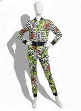 Step out in striking style with our Monochrome Geo Tropical Tracksuit Set, a fusion of modern geometry and lush tropical vibes! This eye-catching two-piece set features a crisp white base intricately detailed with a bold black geometric maze pattern, artfully interwoven with vibrant green and brown palm leaves.