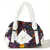 Stand out from the crowd with this playful and trendy bowler bag. Officially branded with "Sex and the City," this handbag features a lively abstract print paired with bright white accents, making it a perfect statement piece for casual outings or weekends away.
